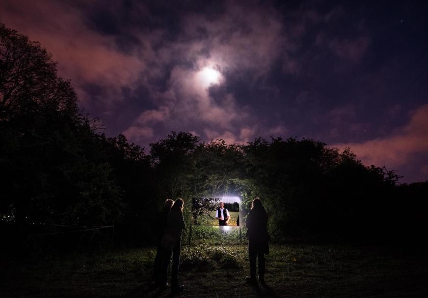 For The Birds is art as event, described in the Brighton Festival programme as “an immersive night-time adventure into a wild avian landscape”. It takes place throughout the Festival and, judging from its opening weekend, looks likely to prove very popular. To attend, you take a bus from one of two spots in Brighton (one central, one outlying) and are shipped to a “secret woodland location”, then asked to follow lights strung overhead on a mile long trek during which a wide selection of pieces boggle the eye, ear and mind.