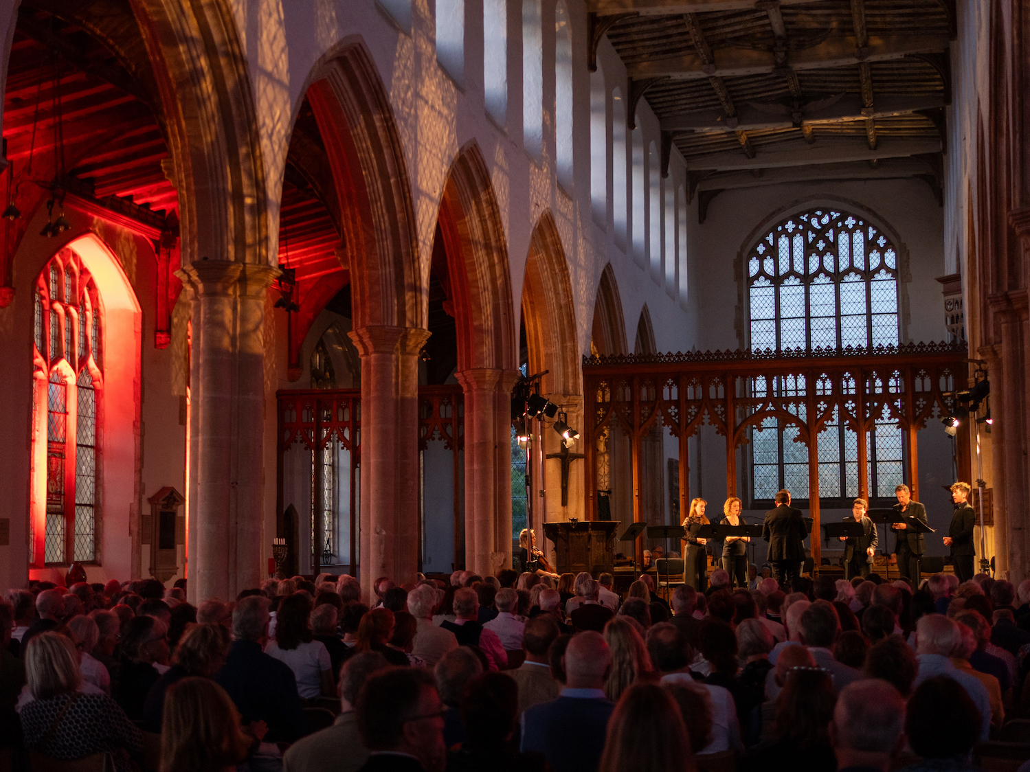 At Blythburgh church, as the sun set in lingering glory across the marshes, the vocal group EXAUDI and their conductor-composer James Weeks approached the transition between feelings, words and music in a more austere and enigmatic vein. In Book of Flames and Shadows, Weeks and his six singers braid Renaissance poetic texts on love by Petrarch and Pietro Bembo with Weeks’s own spare and fragmentary pieces, and an interwoven sequence of madrigals by the 16th-century composer Jacques Arcadelt. In Weeks’s work, with the excellent EXAUDI ensemble (pictured below by Marcus Roth) accompanied by Sophie Appleton’s violin, words and music break down into isolated cells and chunks – stray syllables, notes, phrases. At length the (relative) polyphonic richness of the Arcadelt madrigals gather these solitary elements into a nourishing plenitude of harmony and feeling. Immaculately executed, it made for a tantalising if gnomic experience – almost a creation myth for the post-Renaissance vocal music of love and longing that we now take for granted. But then Aldeburgh has the special ability to take its willing audience on adventurous – even exacting – musical journeys in settings as blessed as Blythburgh at sunset.