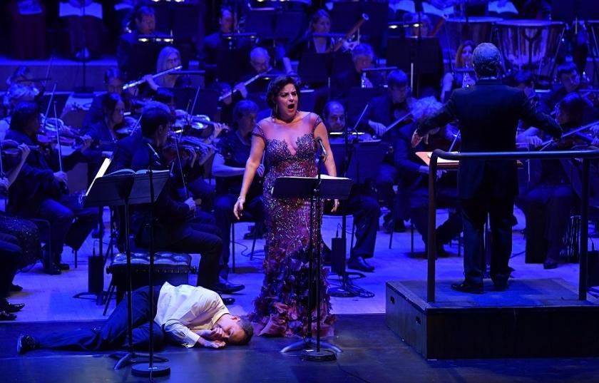 If Pons sometimes seemed delberate in his tempos here, he got all the definition he needed, and let rip with the colour in the opening tableau of Goyescas after the interval, complete with a flaming if score-bound chorus in the expert BBC Singers. There was uncredited assistance here from Kenneth Richardson’s minimal but telling concert staging and some bold lighting which plunged the stage into purple and blue, with crescent moon, for the night scenes. Three of the four Latin soloists owned the stage: fine baritone José Antonio López as swaggering toreador Paquiro, Lidia Vinyes-Curtes as his maja (Madrilenian girl), and above all Nancy Fabiola Herrera as the classy but troubled Rosario (pictured below second from left, with Gustavo Peña at her side). Granados’s odd attempt to turn his piano pieces and other extant material into a series of operatic tableaux is unbalanced, a bit like starting Eugene Onegin at the party scene and ending with the duel, or in this case its aftermath. There’s no chance for the singers to build up their characterisations: Fernando (Gustavo Peña, a ringing tenor with a bit of a problem with support and a disconcerting habit of putting his hand to his ear in several entries, no actor he) is needlessly jealous of his Rosario, and doesn’t need much provocation from Paquiro to challenge him to a duel at a lantern-lit ball. The denouement is inevitable, but teased out with the deepest and most sensuous music of the opera, taken from the two most memorable movements of the two piano suites, “The Maiden and the Nightingale” and “Love and Death”.