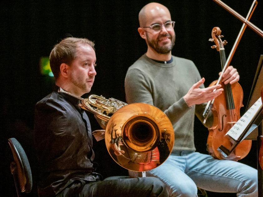 After the interval the Brahms Horn Trio (Klieser with Danny Driver and Mark Derudder pictured below) rehearsal pictured below) took us deep into the forest. Despite being composed with the almost obsolete valveless horn in mind, Brahms’ horn writing is very much the stylistic pivot between Mozart and Richard Strauss in its natural facility and appreciation of the instrument’s potential learned from his father, who was also a professional player. The first movement was lyrically expressive without indulgence before the players are let off the leash by the rhythmic exuberance of the Scherzo, pausing for breath for the central Trio’s glorious horn melody. The third movement takes the work to an almost symphonic level of intensity. The composer’s mother had died shortly before, and the tone here was appropriately elegiac and grief-stricken. All change for the finale, in which all three soloists joust to see who will win the hunt. Vaulting interplay between the three protagonists made for a thrilling ride to close an irresistibly robust and darkly passionate performance.