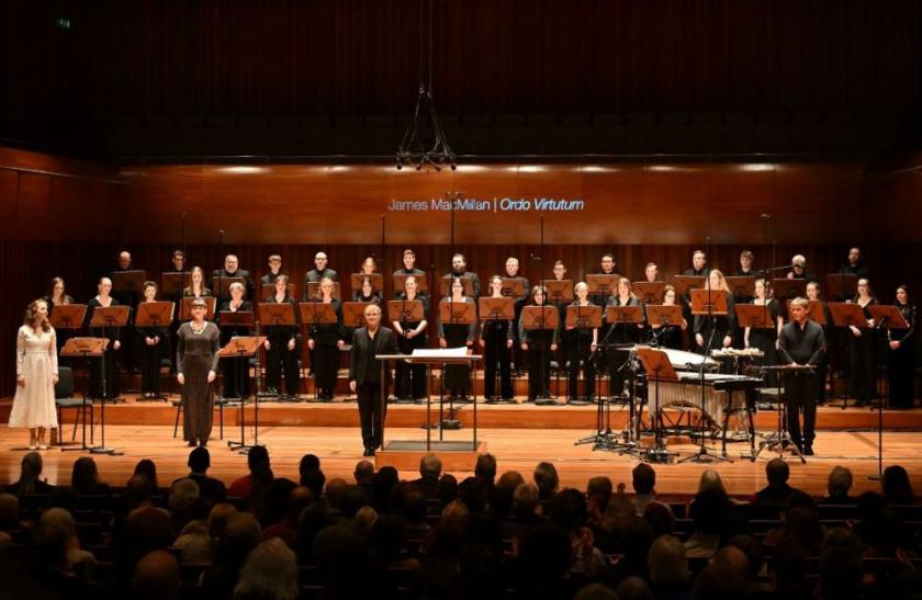 This is, of course, the ultimate triumph for Sofi Jeannin and the BBC Singers in a 100th anniversary year we weren’t at one stage sure they were going to survive to see (Ordo Virtutum was composer in 2020-1 for Leipzig’s Mitteldeutscher Rundfunk Choir, but not premiered by them until January of last year; this is its first UK performance): the many solos alongside Tring and the more choral-soprano purity of Rebecca Lea were all superbly taken, and the great blazes, enriched by an essential ongoing collaboration with National Youth Voices, dazzle and disorientate. They also at times deafen, an unpleasant side-effect of Milton Court Concert Hall, no better than its parent Barbican Hall in over-amplifying, and its coffin-like interior always feels unwelcoming, to me, at any rate. Better, surely, would be a church setting and an element of costuming and acting out; with the performers, however committed, facing us motionless, you’re also conscious that diversity is never the name in British professional choral singing, not even in the youth division. But at least the English translation could be projected on the back wall, and focus.entirely on the music made us realise what a major contribution MacMillan has made, yet again, to the repertoire (the composer pictured above with Lea, Tring and Jeannin). A fascinating sacred counterpoint to the profane drama of Turnage’s Festen earlier this week – and if not, ultimately, as moving, for me, just as various and compelling.