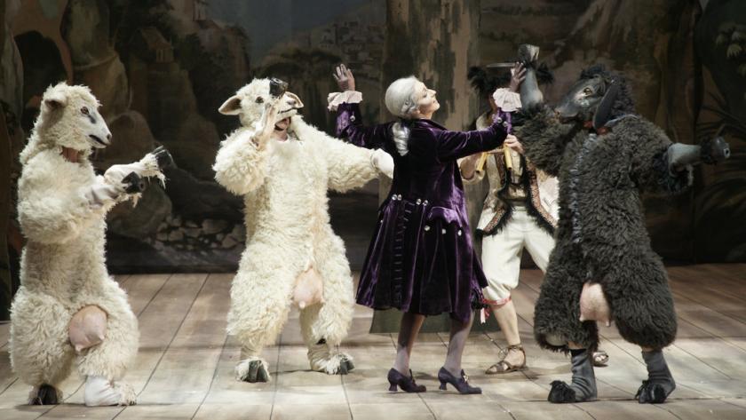 While the constant insistence on this conceit gets a bit weary by the end (even conductor and orchestra get in on the meta-action), by sheer energy and single-minded determination Herheim manages to make it work. It helps that the show never takes itself too seriously. Whole swathes of da capo and recitative are jettisoned, some creative transposing and re-orchestrating assists the flow action, and Haden Matzeit’s Elviro (pictured above) almost steals the show with extended passages of falsetto. Add to this some over-sized (and over-sexed) sheep, Gesine Vollm’s outrageous “period” costumes, and a chorus of sea-creatures, and it would take a stern purist not to crack a smile.