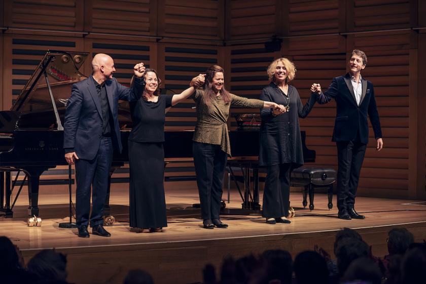 This first half had the best things, and the (very long) second half couldn’t quite live up to it. The Sally Beamish premiere Sonnets had the complex conceit of acting out the three-way relationship at the heart of Shakespeare’s sonnets – between the poet, the “fair youth” and the “dark lady” – in terms of three pianists at two pianos. Getting musicians to act always risks being a bit eggy, and despite their best efforts Owen, Collins and Apekisheva (pictured below) struggled to sustain the idea through its 18 minutes. Beamish’s music was at its most interesting at the beginning and the end, when it mused on Dowland, but all the swiping left on a phone, the bumping each other off the piano stool, the yearning looks and the storming off: it didn’t work for me.