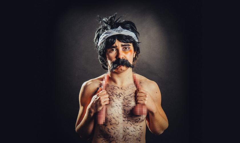 Then, after approaching a few women in the audience with sexual come-ons, Nate challenges his "ex-girlfriend's current boyfriend" (avoid the front row at all costs) to a duel, while another poor chap in the audience plays Nate’s “best buddy” (no seat is safe for this one). While there are some easy laughs in these set-ups, many of them are designed to make the audience feel deeply uncomfortable. This is, after all, a nearly naked woman, pretending to be an sexually aggressive man, while sporting a large, exposed prosthetic penis.