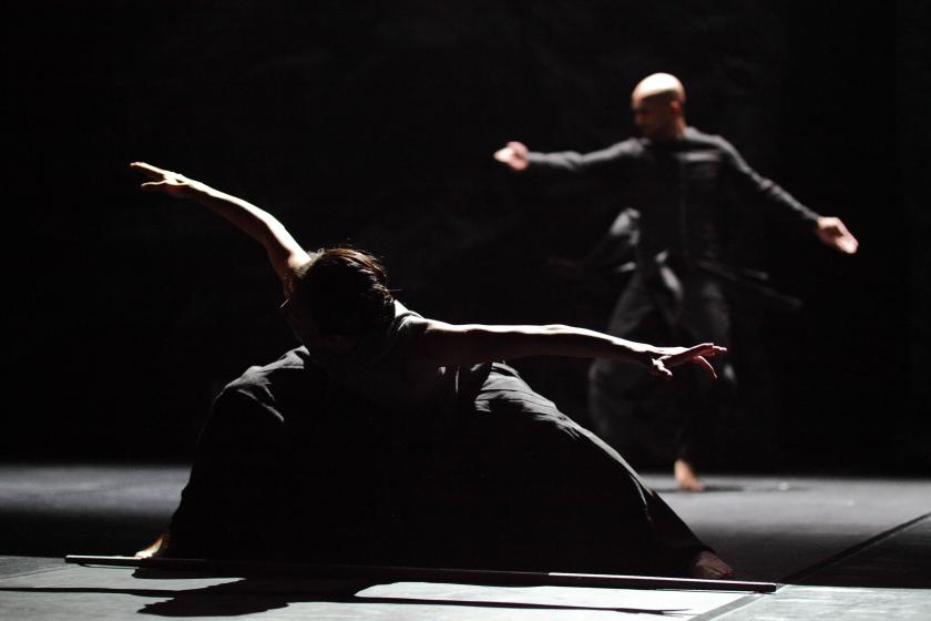 Fang-yi’s opening solo showcases her strength with chalky downlighting that picks out her arm and shoulder muscles, and her stage presence builds to an almost unbearable intensity as she moves in silence for the first several minutes. It’s a relief when eventually the percussion kicks in and the solo becomes a thunderously powerful representation of ceremonial drumming. During the body of the piece I lost track of what exactly was supposed to be happening, but plenty of individual moments stood out: Fang-yi walking over Khan, or manipulating his limp body with her white stick, that is sometimes a blind person’s walking pole and sometimes a weapon, a fighting staff. The story ends with both of them dying in a forest fire, and both dancers deliver blistering solos in which their bodies become both flesh and flame, licking, flickering, contorting and finally coming to rest in stillness. There is a moment of stillness in the audience, too, before it breaks out into rapturous applause.
