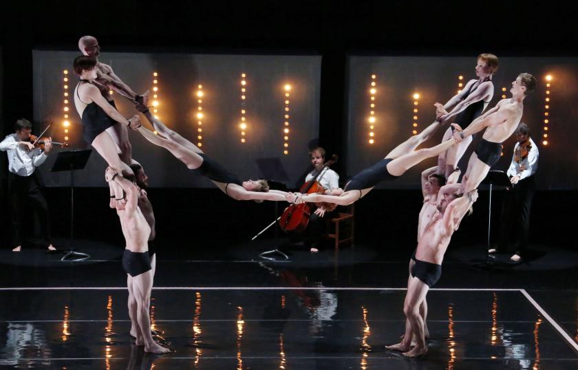 The Debussy players give a tremendous performance, never losing power or focus even as they are pushed around by the acrobats, blindfolded (they play much of the Quartet No. 5 blind, pictured right), or stood right in the middle of the action acround them. Minimal but highly effective stage design recalls Wayne McGregor's recent works – a backdrop of screens with points of warm light, thin neon lines on the floor, alternation of side, overhead and spot-lighting – but without the trumpeting of artistic depth. In fact, a quiet modesty pervades the whole production; programme notes are minimalist indeed, though both ensembles have plenty to shout about.