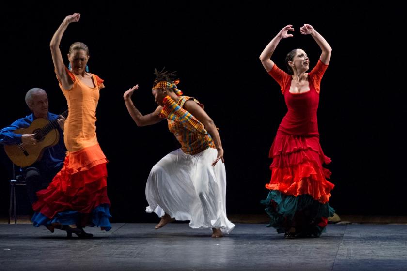 Peña is no doubt sincere in giving his own impassioned take on travel in search of a chimerical (hence the title) better life, the pain of emigration for west Africans (that’s as far as I’d compromise in so naming the performers from Senegal or Guinea; labeling them"Africans" as the programme does at times is about as sensitive as describing the flamenco troupe simple as "European"). It works fine when briefly conjured, as in Peña's second-half solo against a voice reciting Caroline Bird’s poem “Feet on Road”. But it makes a laboured context for the first half’s culminating showdown of feet, hands and drums as a confrontation of a buleria with “Fore Sacre”, the west African team’s supposed reaction to official Spanish aggression against immigrants. And it sabotaged, for me at any rate, a 20 minute flamenco sequence in a Cordóba tavern suggested by a semi circle of chairs which keep out the African waiters. Their presence might have been suggested in a minute, but instead they linger to make us uncomfortable before the free and the oppressed finally come together.