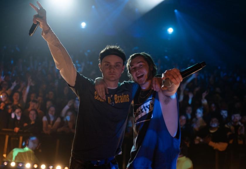 The madcap plot is held together by Seamus McLean Ross as Gavin Bain (pictured below, front, with Sam Bottomley) and Sam Bottomley as Billy Boyd (the rappers’ real names). Gavin is the Liam Gallagher of the duo, mercurial and wayward; he doubts his obvious talent and starts fuelling himself with whisky and recreational drugs. Billy is the more grounded, quick-witted and smart, though even he strays with one of the hangers-on that he and Gavin, now reborn as “Silibil N’ Brains”, inevitably attract.