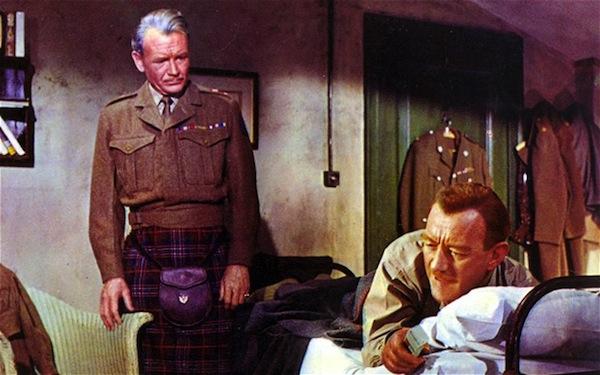 Basil Barrow (John Mills) is a proud, repressed, upper-class lieutenant colonel who was traumatized by his experiences in a Japanese POW camp. Shortly after the war, he fulfils his ambition by taking command of the Scottish battalion once led by his grandfather. When his by-the-book methods are ignored, his stiff upper lip doesn't quiver, but one of his eyes twitches dementedly and his head looks as if it it might burst, like a plum. Mills was able to twitch that eye at will.