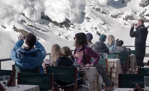 The fact that it appears to be a “controlled” avalanche – if that doesn’t seem a contradiction in terms – designed to control the slopes, doesn’t in any way detract from the terror of the scene. Ostlund, a master of post-production techniques, edited in a real avalanche into this otherwise pastoral foreground scene: the volumes of snow that advance at us, the viewer, just as they do at the characters, seem as real as they can be, even recalling the very illusions of reality with which cinema itself came into being. But as the eruption of snow subsides, the emotions to which it gives rise will only fester.
