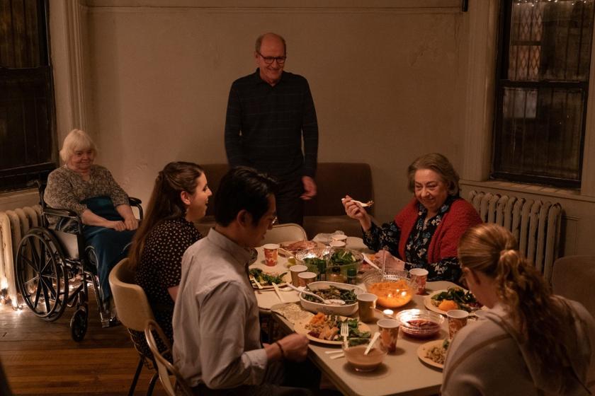 Richard Jenkins and Steven Yeun in 'The Humans'Except, of course, that Karam never loses sight of this family, who are seen to exhibit a decay mirrored in the physical disrepair around them. "I love you, I'm just saying," says Deirdre offhandedly as she calls her daughter's attention to a broken toilet, and once they sit down to the actual meal, the cross-current of conversation reaches a fearsome crescendo. While care is given to the elderly, dementia-ridden Momo (June Squibb, a onetime Oscar nominee for Nebraska), we hear more from elder daughter, Aimee (Amy Schumer, in terrific form), dealing both with ulcerative colitis and abandonment by her (female) partner.