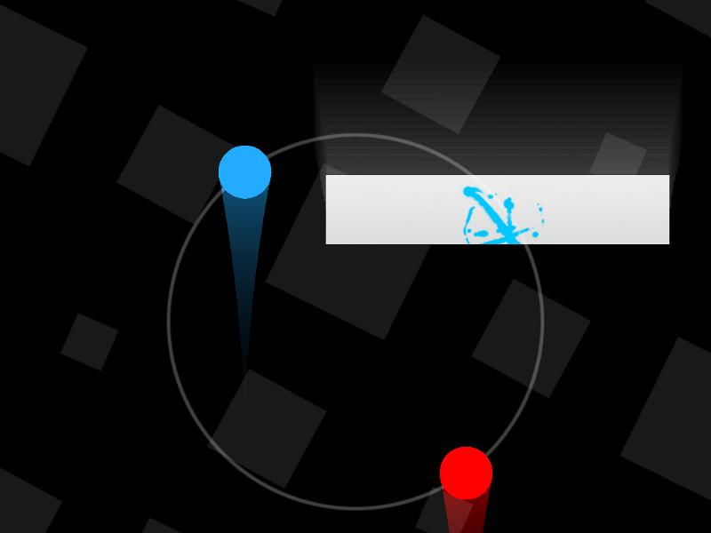 Your two balls, red and blue, are fixed on opposite sides of a thin ring and they move in concert. You rotate the ring clockwise or anti-clockwise by tapping and holding a finger on either side of the screen. In each level, white shapes move slowly towards the balls and you rotate the ring to move the balls out of the way.