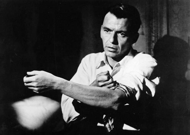 It must have been a frustrating film for younger fans of its lead actor Frank Sinatra, who was nominated for an Oscar in his role as Frankie Machine. Anyone aged less than 16 couldn’t see their idol without resorting to some sort of subterfuge. Sinatra’s Machine is a card dealer just released from jail; he’s now clean, but was a heroin addict before. While inside, he’d taken up drums and has a new ambition to join a jazz band. But returning to his low-life infested Chicago milieu brings him and drugs close again. He’s pitched into a dark world where he has to balance his wheelchair-confined wife Zosh (Eleanor Parker), who wants him to return to his old ways, and Molly (Kim Novak, pictured above right with Sinatra), the nightclub hostess who lives downstairs and stands by him.