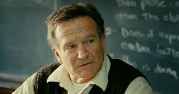 Williams plays Lance Clayton, who has a failed marriage behind him and is a failed writer - his rejected novels include the titles The Narcissus Life Vest and Door-to-Door Android. Dressed in sloppy cardigans and ankle-swingers, he looks like a loser and teaches an elective poetry course at the local high school, whose few attendees either cannot write or who routinely plagiarise pop songs for their work, and are there only because they need course credits to graduate.