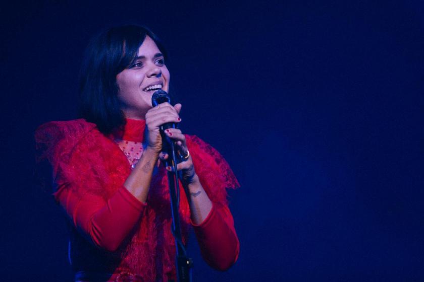 Khan’s “ode to the English countryside”, “Land’s End”, is then sung by an LA artist missing home’s “fog and rain”. Her exploration of the “eerie” Dartmoor landscape which inspired it, she explains, ended with her equally unsettling, cloaked male guide encouraging “a blessing and a prayer” at an ancient rowan tree. Guitar now in hand, she sings of escaping “city lights” to let “my soul be free and spirit fly”. Her open-minded, all-embracing attitude to religion, spirituality, sexuality and myth feels right at home with a golden statue of Christ hanging above her, and stage lamps which glow like candles. It could be a wildly non-denominational, semi-secular Evensong.