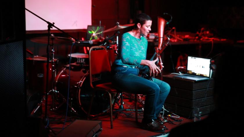 Perversely it started without any computers involved at all. Joanne Cannon's initial performance was a flurry of bassoon improv, her hands flying over the instrument with wit and funkiness as she demonstrated the full catalogue of its sonic capabilities from clicks and hisses to bovine bellow. But this was just setting out her stall, demonstrating the coordinates of improvisation, before she set it aside and picked up an entirely more involved contraption (pictured right)The Serpentine Bassoon. This beast, as well as its coiled woodwind tubes, was covered tin switches, panels and a joystick, wired into a laptop, and produced the most mind-boggling array of echoes, feedback, fragmentations and other processings. Being primed, though, by her demonstration of what she could do with acoustic instrument, this seemed bizarrely natural, and of all the things we were to see, this was the one that made computer music feel like something compatible with the human body.