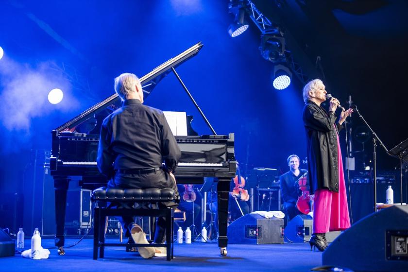 Collins has been performing Wildflowers across the United States for a few months now, but Cambridge marked the concert’s UK debut. On stage with her was Russell Walden, her long-time pianist and musical director, and the Unity String Quartet. By her own admission, there had been little time for rehearsal, but the only real fault lay with the sound. Festivals like this are never easy – a big tent to fill with sound and no time to soundcheck. Where I stood, the low notes of the cello were often overwhelming, muddying the delicate arrangements. (The squawks from a security guard’s walkie-talkie were unhelpful.)
