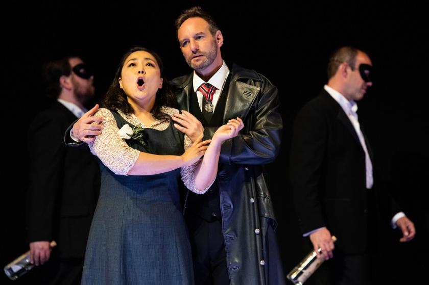 From photos taken at earlier performances in Glasgow and the Lammermuir Festival back in September, the worry was that director Emma Jenkins’ thoughts would tend too much to the troubled 1930s in which Strauss, with his knack of detaching himself from dire circumstances, composed this mythic one-acter. Daphne, the chaste nymph who is turned into a laurel fleeing the advances of sun-god Apollo, is suggested as Sophie Scholl, and the famous symbol of the peace-oriented White Rose resistance movement becomes central, Apollo is an overweening officer in a leather coat and the rest are still celebrating in the style of the Weimar Republic (Hye-Youn Lee's Daphne pictured below).