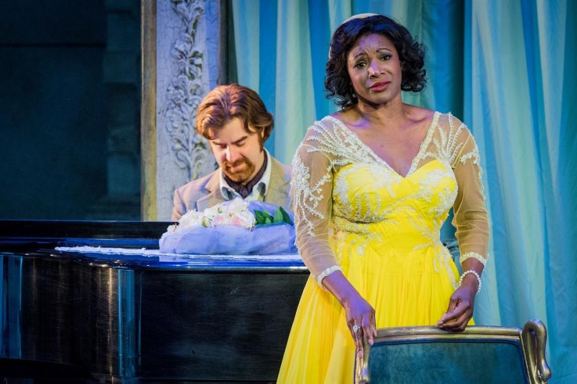 Act Three of Opera Holland Park's La RondineThe lighter couple, caddish musician Prunier and maid Lisette (for which read Rosalinde's Adele from Die Fledermaus, a girl who also wants to go on the stage but here gets to fail at it), are decently taken by Stephen Aviss and Tereza Gevorgyan (pictured above with Llewellyn in Act Three). I'd have liked more light-tenor charm, though, from Aviss, who's perhaps too baritonal at times. But in Matteo Lippi we have the genuine Italian article for the cipherish Ruggero: affable of manner, all at one loudish dynamic level, perhaps, but the top notes are never in doubt.