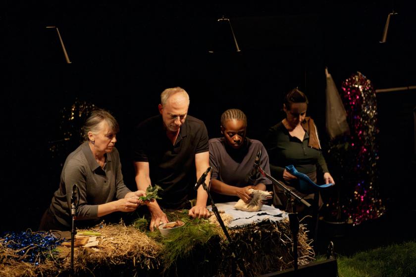 A co-production with the National Theatre of Greece, Cow | Deer is designed by Alex Eales, with Foley score by Tom Espiner and Ruth Sullivan, who perform on a stage full of sound-effect gadgets, some specialized, some domestic, along with actors Pandora Colin and Tatenda Matsvai. The sound quality is superb. I have to say that the effect of the performance is both mind-expandingly extraordinary and brain-crushingly banal. There’s a real sense of occasion with a performance that encourages you to close your eyes and just listen, yet there’s also an irritating feeling of predictability and familiarity with the content. More paradoxical, perhaps, than just ironic.