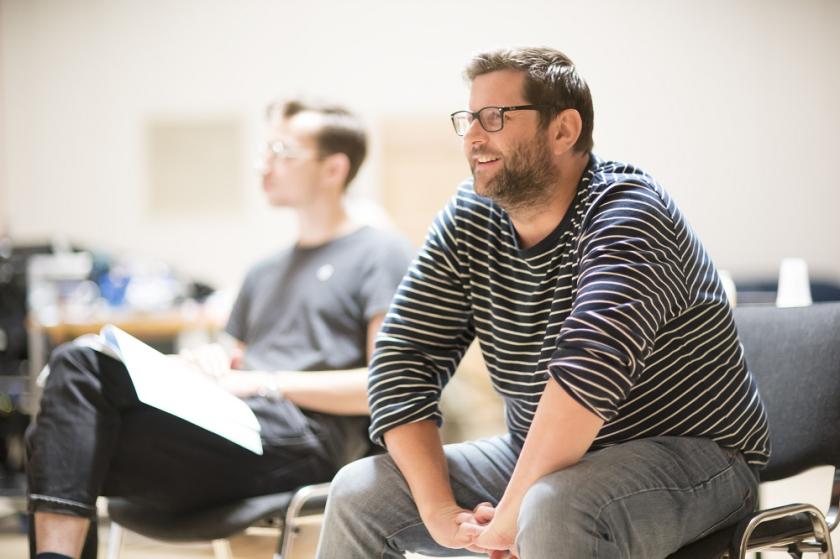 On screen you’re cutting away all the time; and often the cut itself tells the story. A man with red hair walks towards another man with black hair brandishing a knife. Cut to a bathroom as the man with red hair washes blood off his knife. We know he’s killed the man with black hair. Job done. But in theatre it’s all about sustaining action. Too many scene changes, inelegantly done, make for a tiresome evening in the theatre. I was also interested that in plays and films love scenes tend to last no longer than a few minutes. They don’t often feel like encounters as we experience them, when one may or may not manage to kiss someone. I’d never written a play as a single action before and it felt like an opportunity to really write with full commitment the awkwardness, embarrassment and courage it takes to talk to a stranger you’ve taken a shine to. (Pictured below: Sam Troughton, Polly Findlay and Justine Mitchell in rehearsal for Beginning at the National Theatre)