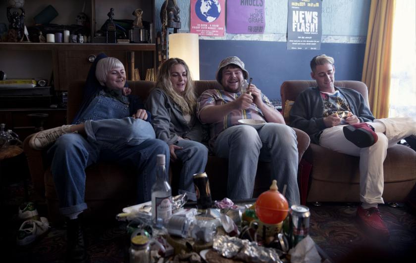 Woody (Joe Gilgun) now sports a beard and is living happily with Lol, who’s serving up at the canteen of the local school. Not that his parents (Steve Brody and Rebecca Manley, pictured below, far right) aren’t plotting to get him back into gainful employment, springing a surprise here in the most surreal form, and generally acting as parodic embodiments of conventional life. It doesn’t help that Woody’s ex is staying with them either, though that gets resolved in a hilarious later telephone conversation, which we see in split- and even triple-screen. (Just what is it about split-screen that automatically seems so retro?)
