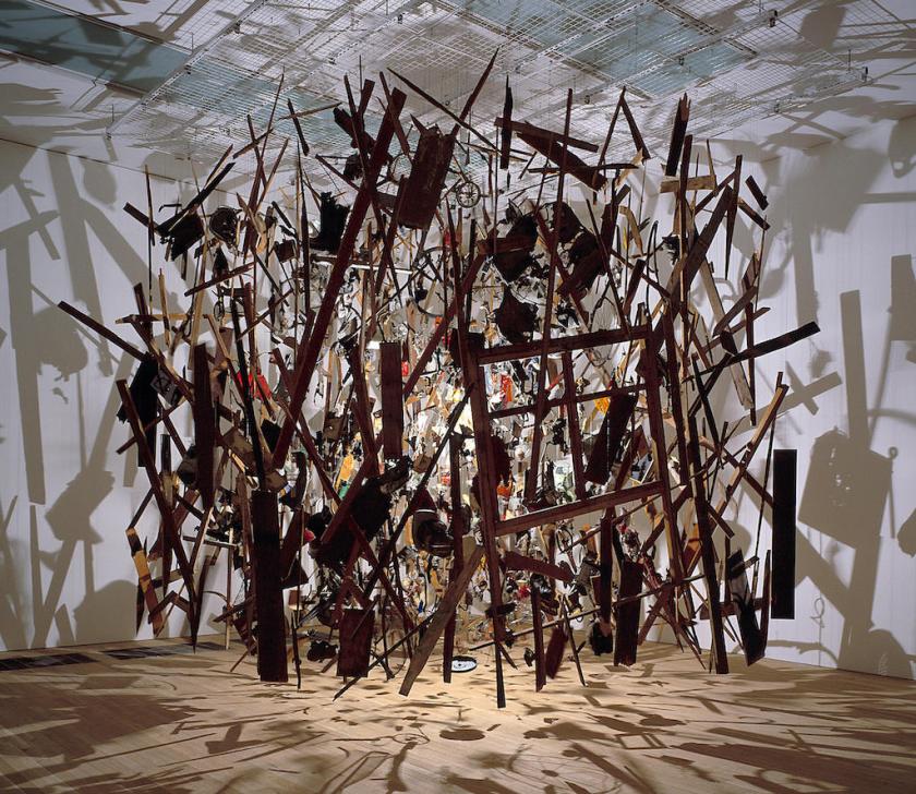In 2004 she revisited the idea of crushing silverware. Perpetual Canon 2004 (pictured below) is a ghostly circle of flattened instruments hanging at eye level. Trumpets, trombones, saxophones, bassoons and tubas gleam in the twilight of a single bulb – beautiful but useless. The air irrevocably squashed out of them, they pay silent homage to the raucous clamour of brass bands.