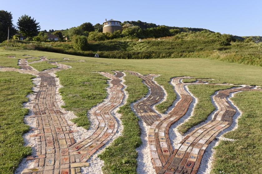 One emblematic work is Oceans Tree of Life (all works 2025) by Jennifer Tee, installed above a coastal landslide known as the Warren (main picture). It is adjacent to a dig site where on this overcast day, an industrious team of archaeologists go about their business. As if to cross-pollinate human ruins with marine life, the Dutch artist has built a maze of hand-fired bricks, which from the elevated north end of the piece can be seen to resemble a marine plant. Inlaid in rust-coloured paving are traces of fossil and also bladderwrack engraved or moulded with sea glass. Tree offers a straightforward meditation on the source of all life on earth, and a celebration of childhood rock-pool finds in places such as this.