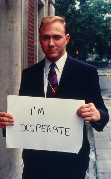 And masking is what it is all about. The clues are in the titles, from the earliest work on. One of the best known is one of the earliest, Signs that say what you want them to say and not Signs that say what someone else wants you to say (phew!) 1992-1993, are street portraits of people. It is a miniature sociological dream in the diversity so nonchalantly exposed, differences subtly indicated by clothes, pose and attitude. Each holds a piece of paper with a handwritten phrase expressive of hitherto unexpressed thought: banal, extreme, vapid, meaningful, despairing, and often at odds with outward appearance. A young black policeman’s sign simply says HELP. A handsome besuited young man shows us that I’M DESPARATE (sic; main picture). The gap between the inward and the outward, the interior and the exterior, is here graphically displayed.