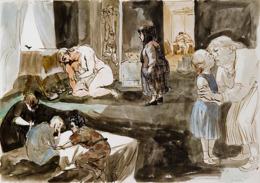 The floor directly above houses paintings of a similar subject, but under a crucially different aspect. Depression Series, 2007, is less surreal, less darkly comic, and perhaps therefore more simply moving. They are portraits by a gentler hand. Each painting, compared to the works positioned now under your feet, is disturbingly muted, displaying – almost invariably – the figure (sitting, prone, or supine) soundlessly struggling to get up in blunt streaks of lightly-then-heavily daubed pastel. Overpainting these scenes of deepest inertia with further tragic force is their history: Rego kept them from public view (locked in a drawer) for ten years, feeling – in her word from a video made to accompany the exhibition – "ashamed" of what they show.