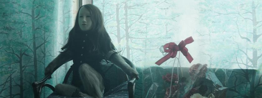 A search on YouTube throws up quite a few of these monkey-waiter skits. Who knew? Perhaps all the footage comes from the same restaurant, since it seems unusual enough to have warranted a jolly “strange but true” item on Japanese news. One segment of this news footage shows one of the monkeys wearing a human mask – a rather grotesque, plump-lipped, little-girl mask, with long, dark hair attached to it, which sways gaily as the monkey moves with its swift, lolloping gait.