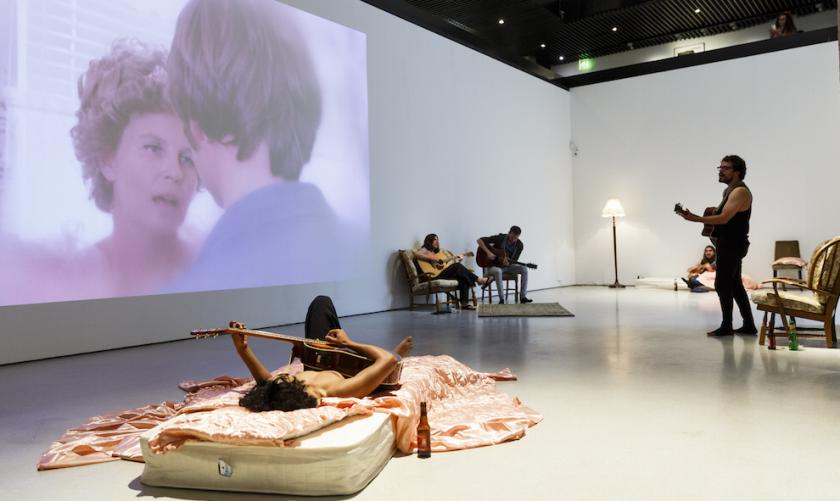 Ten guitarists lounge around the gallery on the kind of furniture seen in the film. For eight hours at a stretch, they sing snippets of the dialogue that intertwine to produce a melancholy ditty about loneliness, lust and longing and the romantic clichés that nurture them. While many of us have a soft spot for silver screen soppiness, few can claim direct descent from a celluloid romance that continued between the sheets in real life. Take me here...is, then, a meditation on the way popular culture and celebrity romances influence our ideas about love, while also being a celebration of the artist’s own origins. Permeating the entire exhibition space, the maudlin harmonies create a mood of languid eroticism that is unlikely ever to find satisfaction.