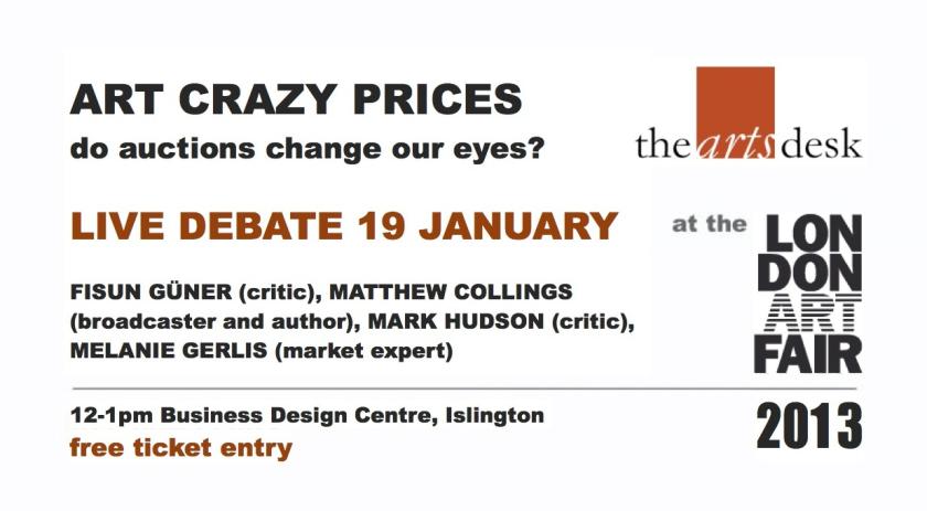 With me to discuss these questions are critic, broadcaster and author of Art Crazy Nation Matthew Collings, theartsdesk critic Mark Hudson and The Art Newpaper’s markets expert Melanie Gerlis. The event is free with ticketed entry to the fair.
