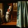 A young woman sits sewing (pictured below right: Young Woman Sewing,1655). She is totally immersed in her task, and our attention is similarly focused on her and every detail of her environment. The cool light pouring though the window illuminates her work and also gives us a clear view. She sits on a wooden platform that raises her above the cold floor tiles; on one side of her is a linen basket and, on the other, an ebony chair, its carved back and legs picked out with gleaming dots of light.