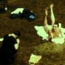 At first the machines are in control. A crane drags the inert body of a woman across the floor, lifts her up and leaves her dangling from the waist. A man follows, dragged by one foot and suspended upside down. The two bodies rise and fall or swing round in a duet horribly reminiscent of carcasses hanging in an abattoir.