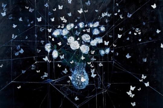 On a humorous level it is a bit like being in U2 and not selling T-shirts. I have friends who make sculptures and I always encourage them to do paintings. Paintings are great, I like how by turning 90 degrees it becomes a line and disappears. There is a certain amount of illusion in painting. I am very pleased with the painting with the roses and butterflies, I think something happens to the image that gels it all together.