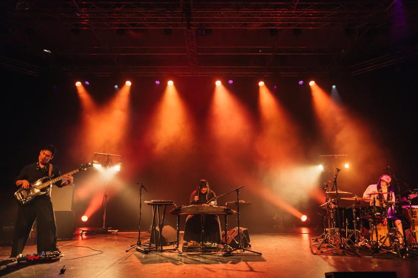 A minute before coming on stage, the audience is asked to observe a minute’s silence for the victims of the Halloween tragedy in the central Itaewon district of the South Korean capital of Seoul. The stage is dark, clouds of dry ice forming a vignette around the three sets of instruments – Ham Minhwi’s bass guitar and pedals, Jang Dohyuk’s drums and Yun Eunhwa’s personalised yanggeum, or hammered dulcimer – and when they walk on stage and set themselves up, we in the audience remain silent until Yun Eunhwa starts to play.