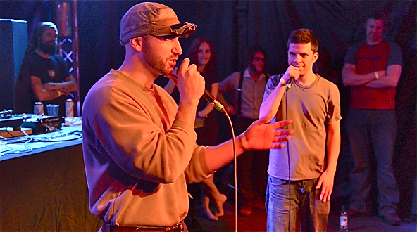Earlier the night had warmed up with members of both teams throwing down verses, followed by a section wherein the MCs freestyled over music provided by DJ Ideal. What’s immediately noticeable is how each poet has their own look, from Spliff Richard’s weed-tinged, crusty-rasta appearance to the bizarre sideburns’n’glasses schtick of Chris Parkinson (whom one rapper rightly points out looks like a Victorian comedy turn). The MCs, on the other hand, are more homogenous, mostly adhering to the low-key leisurewear favoured by the hip-hop community, all fleeces and hoodies, although one – Big Dave – stands out with his Mötley Crüe T-shirt.