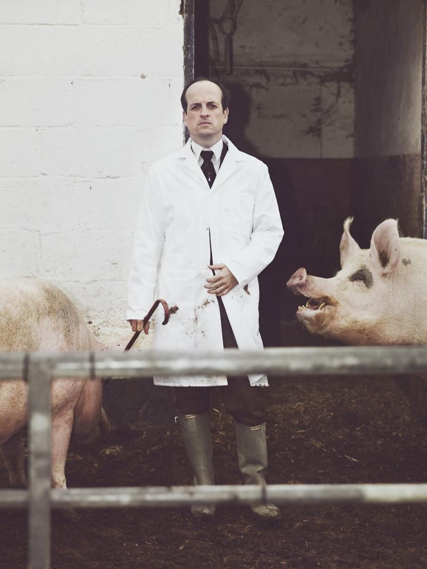 Facing the three tiered, red and gold opulence of this 200 year old venue, the stage is dominated by a small wired pen – a sty. Beside it is a bale of straw. The houselights dim and a man in a white coat arrives and rustles straw in a microphone. This is sampled and looped by another white clad butcher-technician at a laptop. The rest of the straw is distributed on the floor of the pen. Four men in white coats surround the pen, manipulating computers and keyboards. One of them is Matthew Herbert.