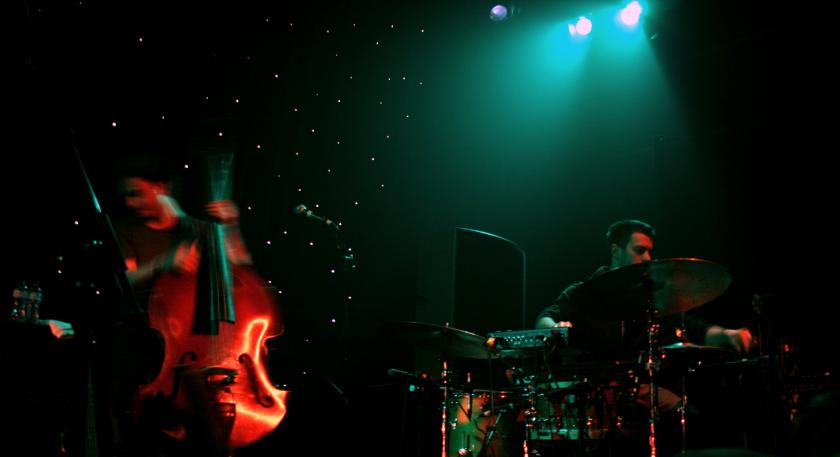 I do not envy the Portico Quartet’s stage manager. The Komedia stage is not very big and most of it is covered in wire, effects boxes, electronic gizmos and other units. Amidst this carnage of cables, before the band arrives on stage, stands laptop DJ, Flying White Dots (aka Bryan Whellams), DJ Rob Da Bank’s “favourite bootleg mashup artist” (so Whellams' business card later tells me). He entertains the milling studenty crowd with his alternative versions of Elton John, Simon & Garfunkel, America and others, as well as Angelo Badalamenti’s grinding "The Pink Room" from the Twin Peaks film.