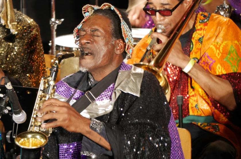 The Sun Ra Arkestra (pictured right) were scheduled as the festival’s penultimate act on Sunday evening, and by then, the schedule was running several hours late, so they didn’t make it to the stage until after 10pm, probably some time after the audience’s peak concentration on the final day of any festival. Since Ra’s death in 1993 they have been led by the utterly indefatigable saxophonist Marshall Allen, now fully 90 years old, who joined the band under Sun Ra in 1958, and is utterly dedicated to maintaining its work.