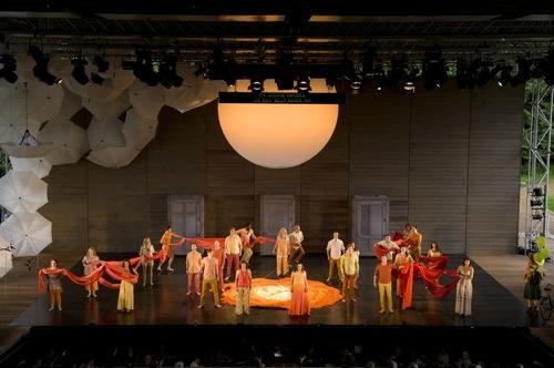 Papageno appears on a bicycle and rides out of the theatre, right round the outside front-of-house, and back in on the other side of the stage, all during the orchestral introduction to his birdcatcher’s song: the death of mystery, perhaps, but one of the wittiest, most brilliant stage entrances I can remember, and one which set up the evening as a kind of domestic pantomime, making the best of mildly straitened circumstances: a spectacular best, it must be added, climaxing in the unnervingly real fire of the first ordeal and the comically bathetic rain shower of the second that will – on wet evenings (which this one, by divine intervention, was not) – unite cast and audience in shared misery and shared hope.