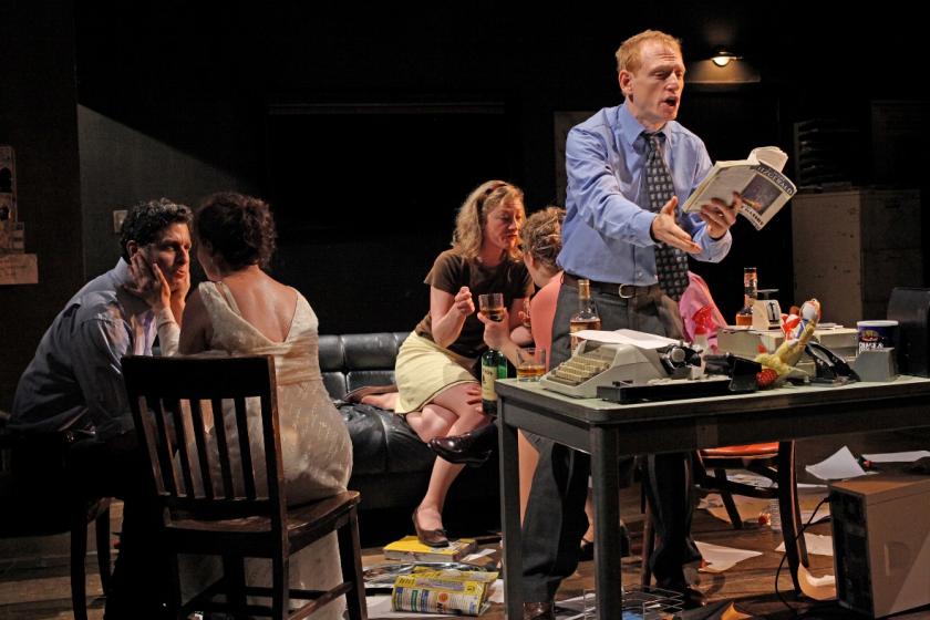 But what Gatz plays with most meaningfully, with help from lighting designer Mark Barton, is the novel’s heightened sense of time, from the party guest who declares he has been "drunk for over a week now" to the surreptitious ripening of summer into autumn and the sudden horror with which Nick realises he’s just turned 30. In the office, time is frozen by a broken clock and obscured by fizzing strip lights. But the collapse of Gatsby’s dream takes place on a stage filling with elongating shadows.