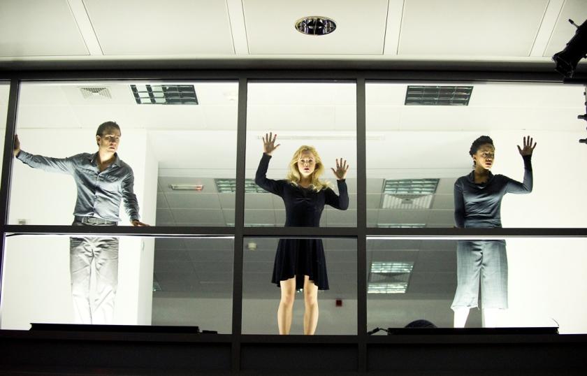 The space works well for them, but once the initial shock has worn off it’s more or less straightforward theatre-in-the-round stuff. Fabulous designer Miriam Buether has had less of a role to play than in, say, Goold's woefully undervalued ENO Turandot, suggesting views at either end of the long space out over Manhattan and that unforgettable 9/11 blue sky from what I’m guessing is an emulation of the World Trade Center's Windows on the World Restaurant. We’re in there at first with the terrorised office-block workers who flail against the mezzanine glass to Adam Cork's ear-splitting soundtrack.