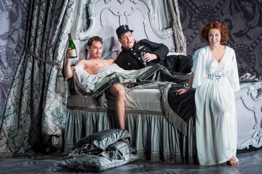 But the biggest and saddest nail in Alden’s coffin comes from the cast’s characterisations. It’s not all their fault: if Alden insists on turning Orlofsky (a trouser role) into a neurotic nutcase or make the lawyer Blind weird beyond belief, there’s not much that Jennifer Holloway and Simon Butteriss can do, apart from secretly groan. Even so, Jan Pohl’s fascist jailor Frosch – he lacks only the swastika armband – is spectacularly unconvincing. There’s a lack of confidence and sharp style about many other players too. Tom Randle and Julia Sporsén struggle to bring individuality to Eisenstein and his wife, while Rhian Lois’s silvery trills as the maid Adele (pictured above left) need more lung power behind them to properly bewitch.