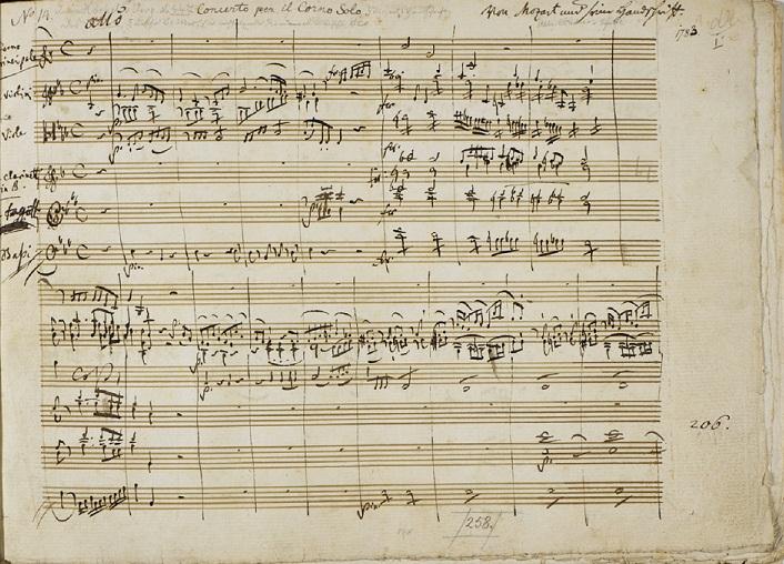The fragment in E major is one of Mozart's most tantalising legacies to horn players. Composed in either 1785 or 1786 it falls after his first concerto for Leitgeb (K417 in 1783) but probably before the second one (K495 in 1786) and his intentions were never clear for the piece. Only one of the horn concertos is complete in manuscript, that of K447 in E flat, but while full versions of others are facilitated by early  editions, this one, K494a, is discontinued, abandoned after a mere 90 bars with a (mostly) fully orchestrated tutti and a sparingly sketched solo exposition which stops just short of the second subject. While there is no dedication to a particular soloist, it is possible that it was intended for Leitgeb, but there is an absence of the playful commentary which can be found somewhere in all of the Leitgeb works. Mozart was in the habit of signing and dating his works upon completion, so the abandonment deprives us of any such specific information. It could be for another player or perhaps it was abandoned before such comments might have been overlaid.
