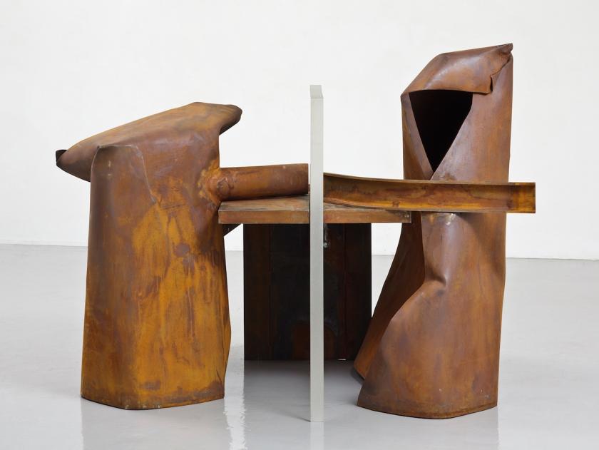 Here are two quite extraordinary meditations, in folded steel and Perspex, on Cézanne’s The Cardplayers: Sackbut, 2011-12 (main picture), and Card Game, 2013 (pictured above). Here the peasants absorbed in the game are transmuted into metal draped with awkward grace, further enlivened by a sheet of neutral Perspex. An aspect of these comparatively small – for Caro – sculptures is the touching way the two crumpled players in Sackbut seem in a kind of relationship: hunched in concentration over the invisible cards, furtively glancing at each other, assessing body language – all in a totally abstract idiom. Card Game, too, is a visual rendering of a form crumpled in a kind of intense concentration.