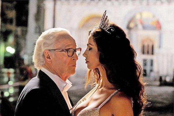 Bathing in a thermal pool (Michael Caine and Harvey Keitel pictured above), they are entranced and tormented by the sight of the naked Miss Universe (Mădălina Ghenea), another guest, gliding past them into the water. Her pulchritude represents what’s behind the door that’s been closed to them for good. (Sorrentino counters the vapid or insincerely earnest beauty queen stereotype by making the young woman warm, shrewd and dignified.) Or almost for good: when Fred’s lissome young masseuse (Luna Mijovic) dips her head towards his loins, eliciting a moan just as Sorrentino cuts away, she is responding less to his calcified sex appeal than to his tenseness.