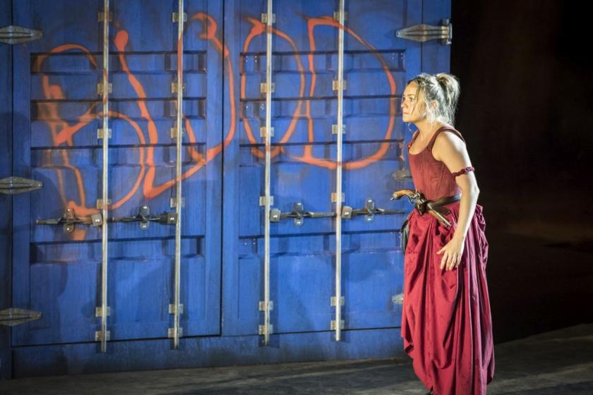 Difficult to pull off al fresco, the play would benefit from enclosure and the intimacy that creates. A more sympathetic design would better support the frantic leaps from Paris to London. As it is, three stacked shipping containers serving as prison, parlour and wine shop prove awfully cumbersome, whilst a good portion of the start offers a maelstrom of opening doors and a dizzying stage revolve. Over time the movement subsides and Fly Davis's set is better utilised, producing scenes of real pathos, such as Lucie waiting in the street hoping her husband will glimpse her from his prison cell.