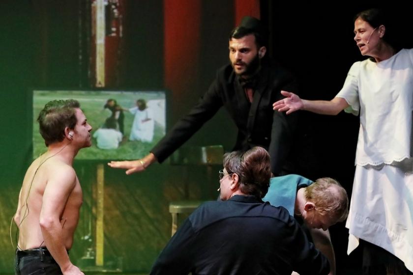 Where does this leave Mailer, who at one point – determined not to be upstaged – sarcastically offers to "take out my modest little Jewish dick and put it on the table"? Here LeCompte has decided he is to be played by two actors – Ari Fliakos, who exudes saturnine smugness, and Scott Shepherd who acerbically spits out the poisoned barbs of his intellectual quibbles. It would be far too easy to dismiss him as a Y-chromosomed monster – the Wooster Group is, after all, above even a post-modern Punch and Judy show. More interestingly we are allowed to see Mailer’s own flaws and contradictions, not least through clips from his critically mauled film Maidstone, in which he plays a filmmaker running for president. (Pictured above: from left, Scott Shepherd, Ari Fliakos and Greg Mehrten, by Hervé Véronèse)